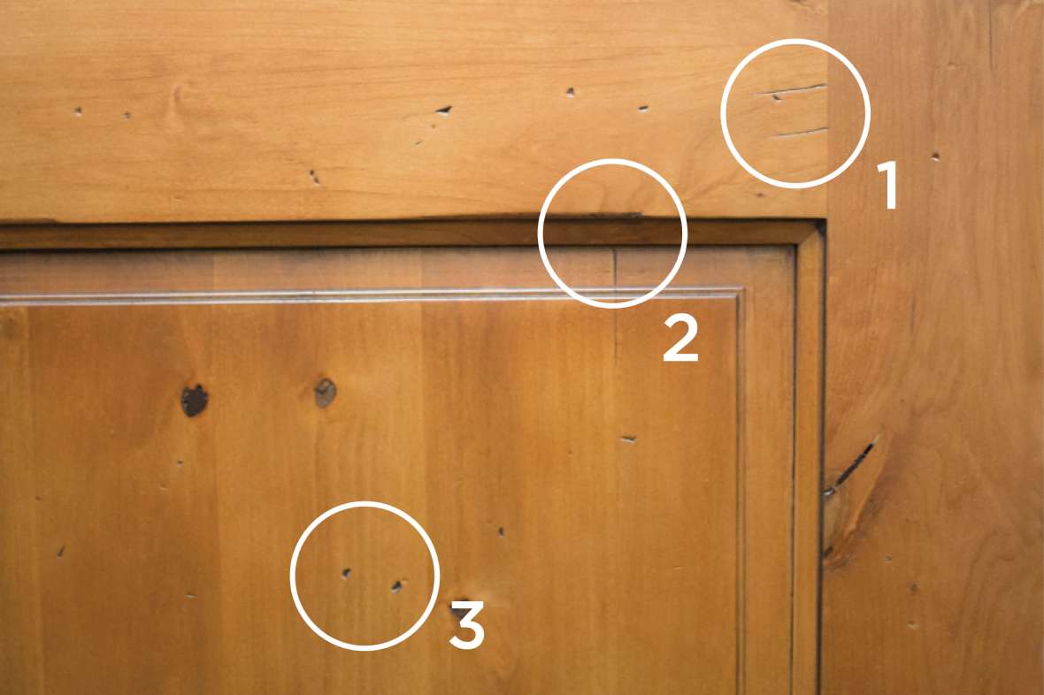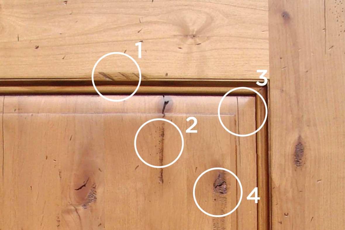 Antique distress applies only to plank (“V-groove”) doors and includes all Medium distress features, with: