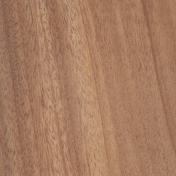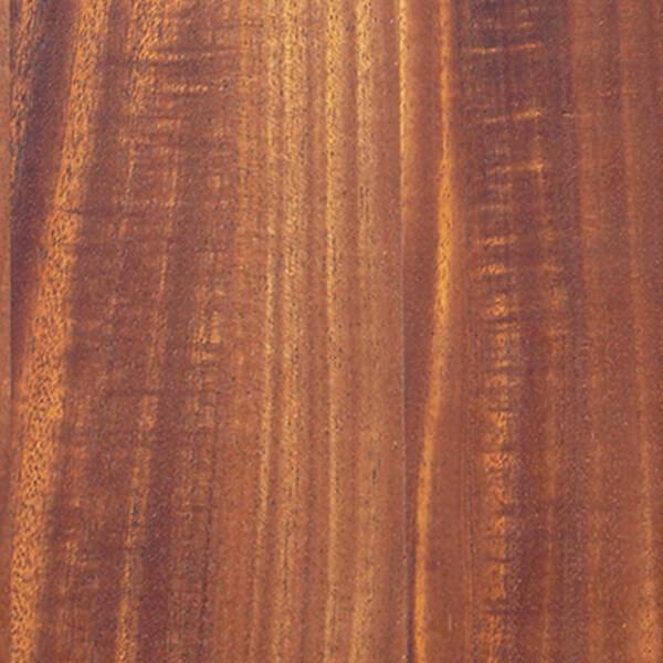 African Mahogany is a hardwood with an interlocked or straight grain, often with a ribbon figure, and a moderately coarse texture. Color ranges from creamy-white sapwood to reddish brown heartwood, often with a purple cast. The species is moderately heavy and hard with medium bending and crushing strength, low stiffness and shock resistance, moderate decay resistance, and good stability. African Mahogany is available only with a Quarter cut. Janka hardness: 840.